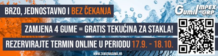 Za svako osobno, 4x4 ili kombi vozilo koje zamijeni 4 gume do 18.10.2025. poklanjamo PREMIUM ZIMSKU TEKUĆINU ZA STAKLA 3L.