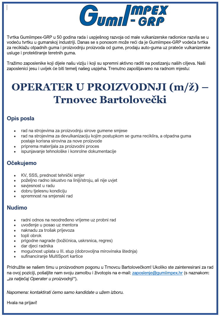 Napomena: samo kandidati užeg izbora bit će kontaktirani, ostale prijave pohranjujemo u našu bazu kandidata. Zahvaljujemo na vašem razumijevanju.