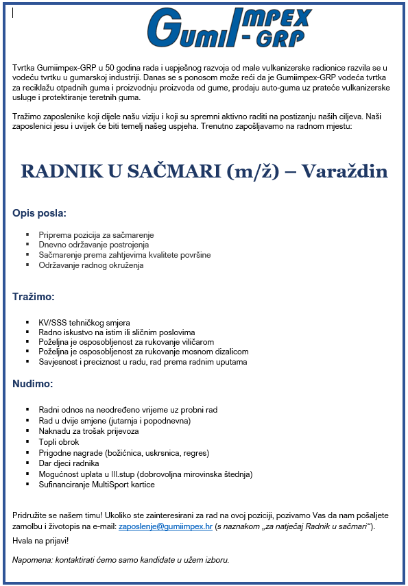 Napomena: samo kandidati užeg izbora bit će kontaktirani, ostale prijave pohranjujemo u našu bazu kandidata. Zahvaljujemo na vašem razumijevanju.