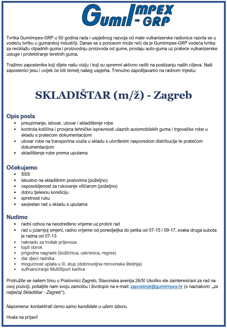 Napomena: samo kandidati užeg izbora bit će kontaktirani, ostale prijave pohranjujemo u našu bazu kandidata. Zahvaljujemo na vašem razumijevanju.